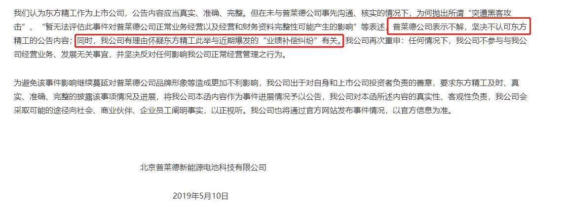 东方精工这一举动,使得普莱德官网已将近一年未更新的“公司新闻”栏目,连发两份声明,称攻击已消除、财务数据信息完整,坚决不认可东方精工的公告内容,并质疑东方精工抛出“突遭黑客攻击”的说法,与近期爆发的“业绩补偿纠纷”有关。