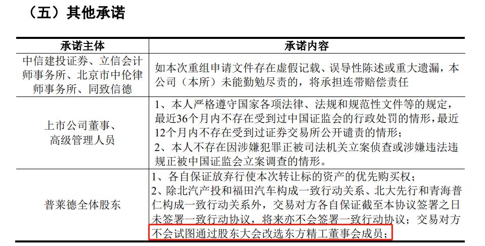 尽管目前利益一致、且合计持股比例超过实控人,但普莱德原股东却难以在法律意义上构成铁板一块。在并购时,普莱德原股东承诺,除北汽产投和福田汽车构成一致行动关系、北大先行和青海普仁构成一致行动关系外,各股东各自保证将来亦不会签署一致行动协议。