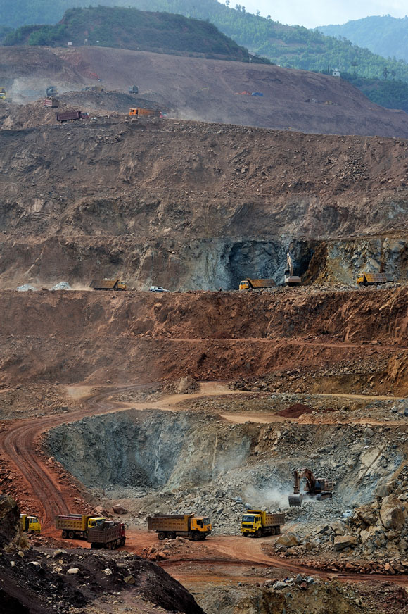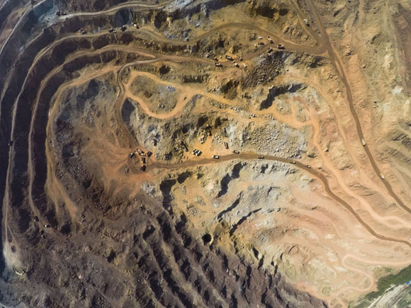 站在山顶往下看,盘山而上的土路横亘在这些矿坑中间。山上另有一些凹陷处被用来填放废矿渣。几台巨大的挖掘机在矿床上挥舞着铁臂,把矿石装满一辆辆卡车。一辆辆重载卡车轰鸣着,尘土飞扬。