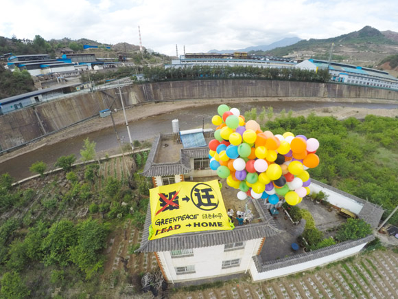 今年5月底的一天,绿色和平组织的工作人员将600多个直径36寸色彩缤纷的大气球固定在麦杆甸村一户人家的房顶上,当时的场面看起来很像动画片《飞屋环游记》的场景。
