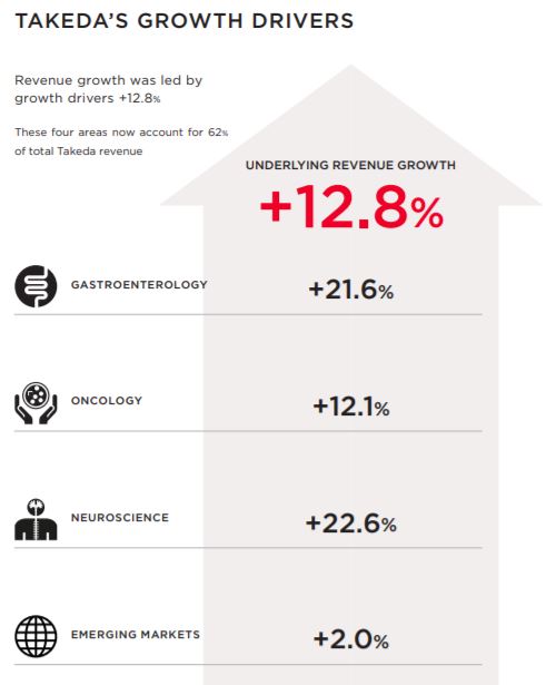 从营收来看,根据武田制药的财务数据显示,武田制药2018年的营收增长12.8%,其中主要受益于消化内科21.6%的增长,以及神经科22.6%的增长带动。