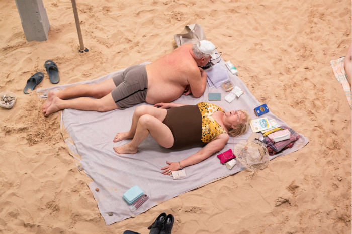 观众们走到二楼,向下俯视中庭,目光如阳光般撒向躺在沙滩上的众人。观众甚至还可以成为“海滨游客”的一员,只要自备泳衣和海滩装备并提前两天申请。艺术家承诺现场提供免费WIFI和适合阅读的灯光,如果愿意,观众还可以带上孩子和宠物为现场增添更活跃的气氛。