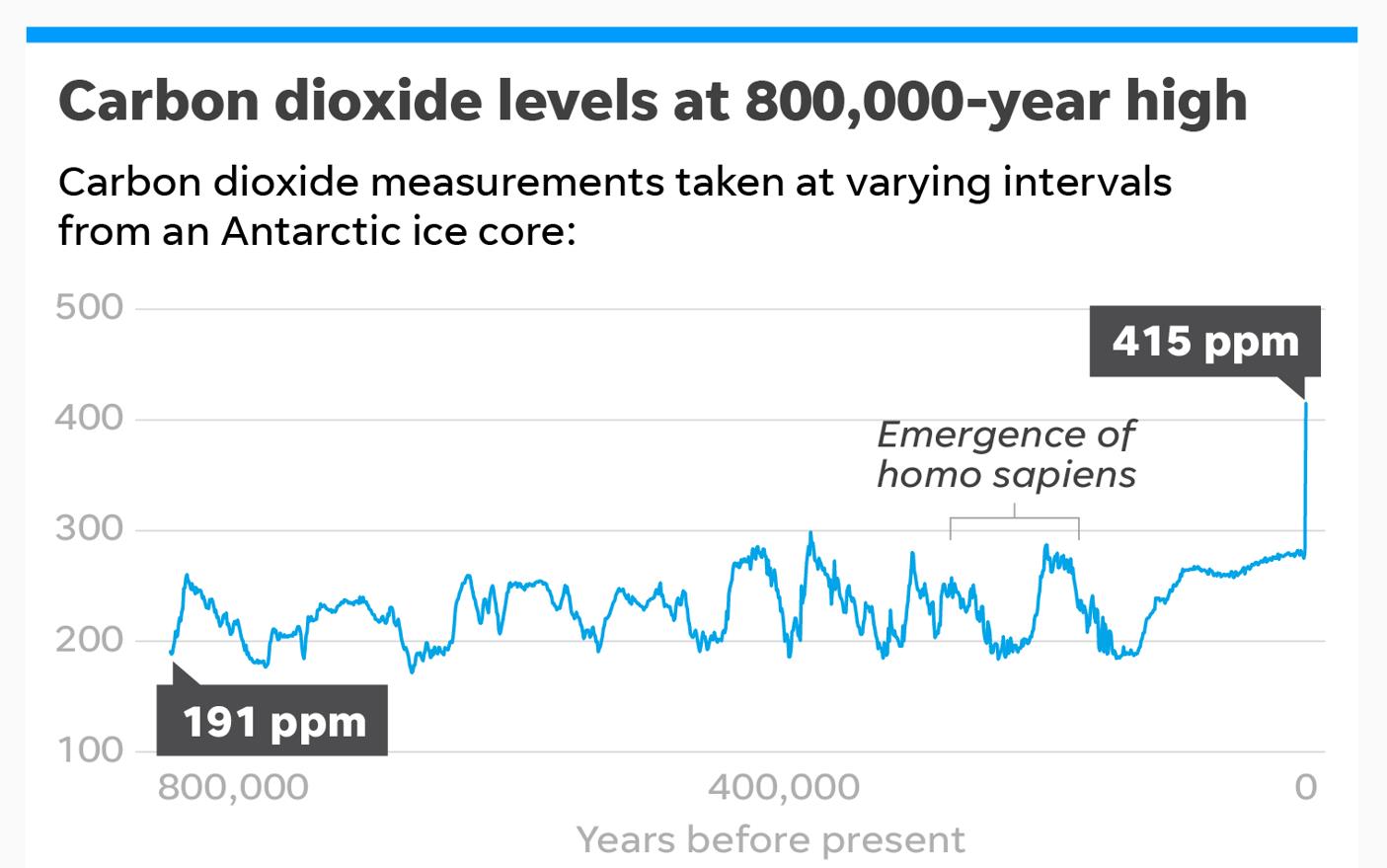 网络环境杂志Grist的气象学家埃里克·霍特奥斯(Eric Holthaus)指出:“地球大气中的二氧化碳含量在人类历史上首次超过415ppm”,“并且这不仅仅是有历史记载以来,也不仅是一万年前农业发明以来,而是在现代人类出现前的百万年以来。”