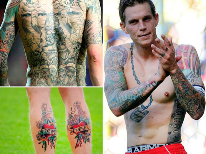 蒂姆·霍华德是美国的一名守门将,他也酷爱纹身。不过现在身上能用的地儿已经不多啦。各式样的纹身虽然不尽相同,却在他身上完美融合在一起。他身上的纹身大多都与家人有关,有他们的名字,生日,甚至还有孩子,妈妈和祖父的头像呢。手臂上的纹身也很丰富,有一个硕大的十字架、星形和龙,甚至连家乡的新泽西州州徽和超人的标志都纹在了手臂上。