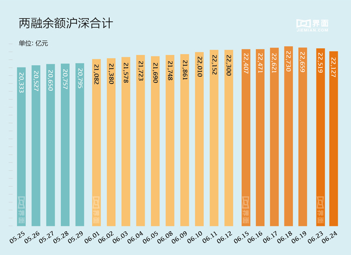 “6·19”大跌当日,带来的除了市值缩水,还有融资融券的余额下降。Wind数据显示,6月19日首次呈现两融余额下降的情况,截至6月24日,更是连续3天余额下降。是近半年来首次三连降。