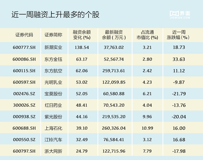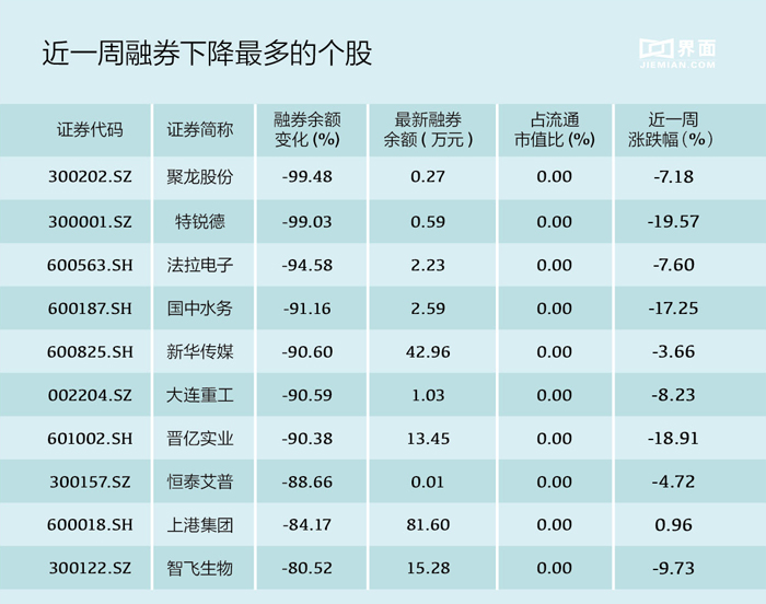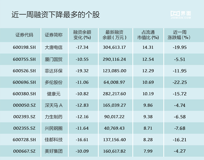 至于三连降的原因,多与“6·19”大跌脱不了干系。分析认为,部分融资买入个股在此轮回调中触及警戒线,选择主动或被迫卖出偿还融资金额,也就是常说的“强制平仓”。经过调整,多数场外配资杠杆较高的投资者可能已出局,达到了“挤泡沫”的作用。而近期融资融券偿还比例较大的个股,也可以认为是前期投资者利用杠杆比例较大的个股。界面新闻整理了近一周融资融券上升及下降比例最多的几只个股。在现在这个节点,严格控制好仓位躲避系统性风险。经过这轮 “挤泡沫”的调整,许多利用高杠杆的场外配资行为也该有所收敛了。