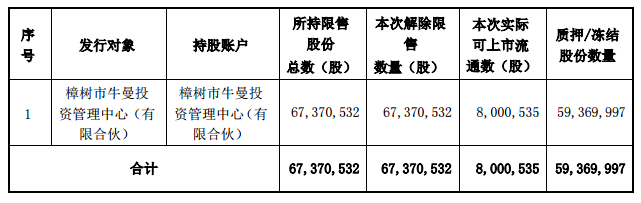 值得注意的是,牛曼投资所持股份正于5月15日可上市流通,解禁股份数量6737.05万股。