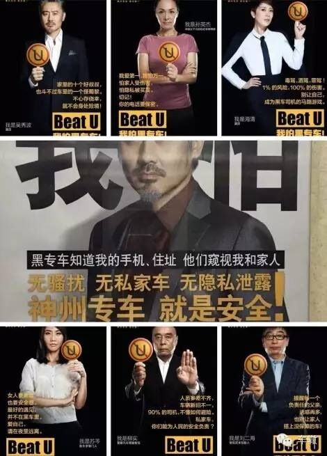 6月25日,神州专车发布的一组名为“Beat U”的海报引爆朋友圈,以吴秀波、海清领衔的一干明星和社会精英手持带“U”警示牌向“黑专车”发起了严厉抵制。而这个大大的“U”,瞎子都能联想到是Uber,即优步。