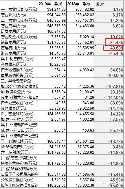 表哥用2019年的一季报和2018年的一季报利润表做了个详细对比,最主要的差异是管理费用(含研发费用)比上年多了4亿左右、销售费用多了1个多亿。其余指标基本和营收同步增长或者基本保持不变。