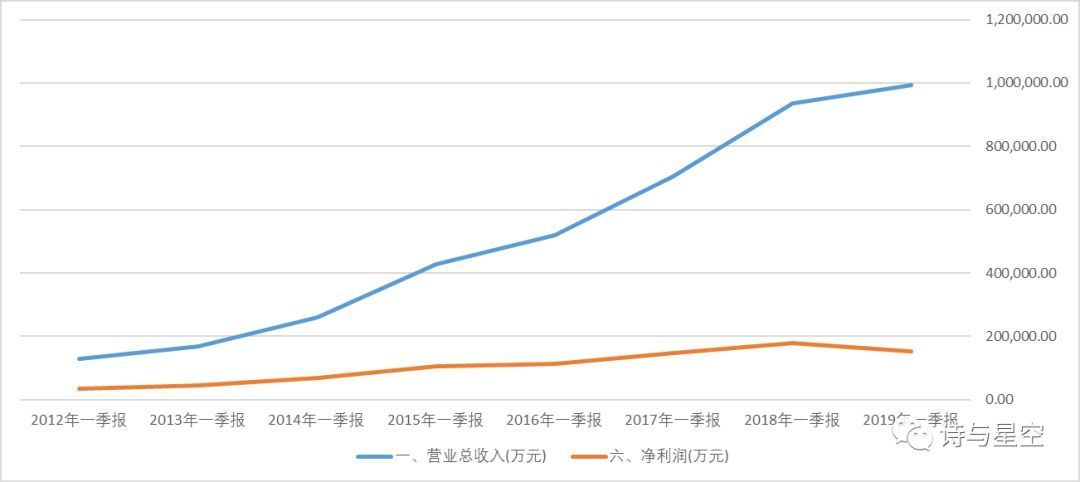 2019年一季度实现营收99.42亿元,同比增长6.17%;归母净利润15.36亿元,同比下滑15.41%。