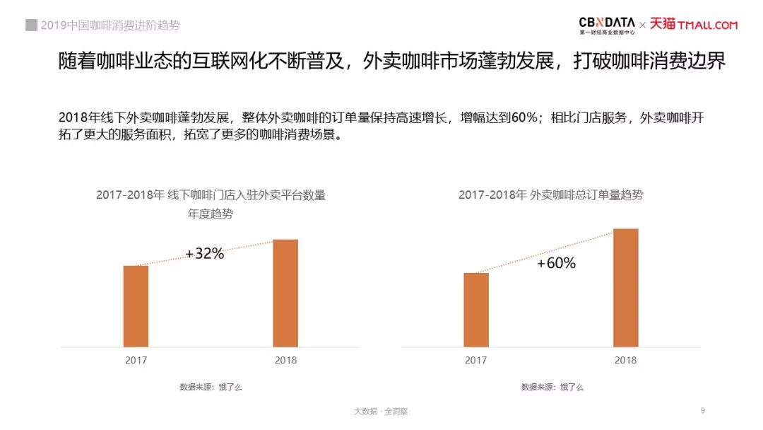 2018年线下外卖咖啡蓬勃发展,整体外送咖啡的订单量保持高速增长,增幅达到60%。星巴克连续两年位居最受欢迎外送咖啡品牌的头名。