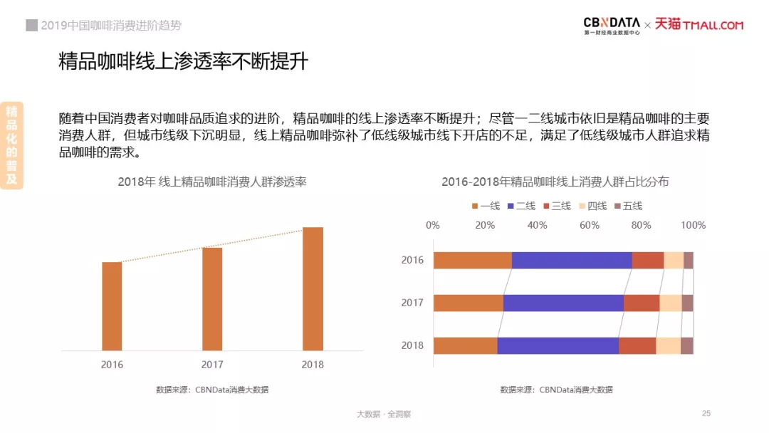 CBNData《报告》显示,随着中国消费者对咖啡品质追求的进阶,精品咖啡的线上渗透率不断提升。尽管一二线城市依旧是精品咖啡的主要消费人群,但城市线级下沉明显,线上精品咖啡弥补了低线级城市线下开店的不足,满足了低线级城市人群追求精品咖啡的需求。