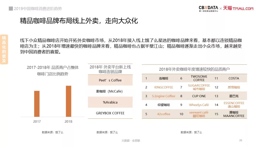 在线下,精品咖啡也逐渐走出小众市场,越来越受到中国消费者的喜爱。从2018年接入线上饿了么星选的咖啡品牌来看,基本都以连锁精品咖啡店为主;从2018年增速最快的咖啡品牌来看,精品咖啡也占据半壁江山。