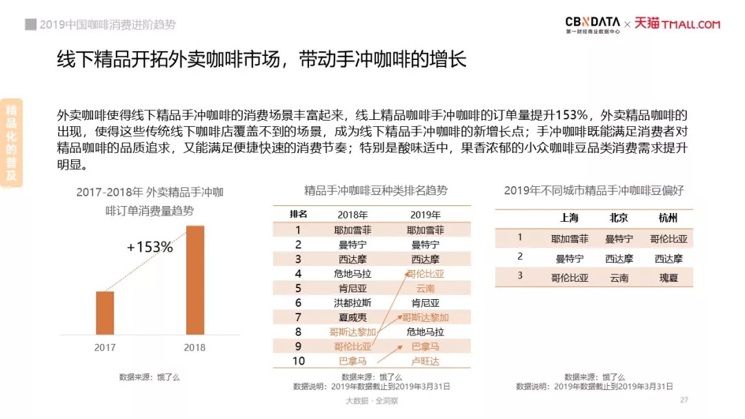 精品咖啡在线下逐渐走出小众市场,2018年接入线上饿了么星选的咖啡品牌基本都以连锁精品咖啡店为主。外卖精品手冲咖啡订单量提升153%,产于埃塞俄比亚的耶加雪菲咖啡最受欢迎。
