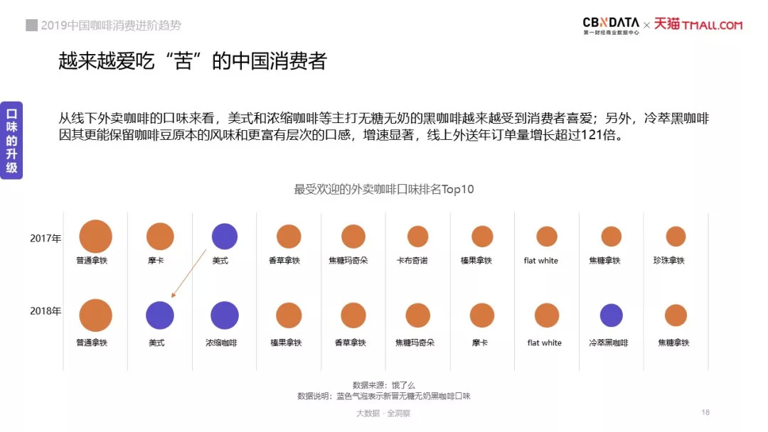 口感之外,口味上,中国消费者也越吃越“苦”。2018年线上咖啡口味消费排名中,黑咖啡位居第二。线上无糖咖啡的消费增速也明显并高于整体咖啡品类。