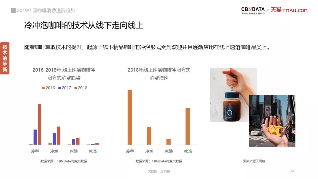 随着咖啡萃取技术的不断革新,冷萃等起源于线下精品咖啡的冲泡形式受到欢迎并且逐渐应用在线上速溶咖啡品类上。