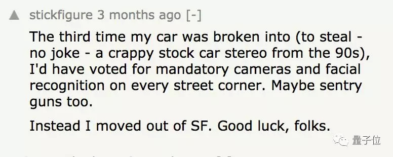 我的车都被人非法闯入三次了,不开玩笑,车里90年代的破音箱都有人想偷。我支持在街角装人脸识别摄像头,不然我就离开旧金山,拜拜了您内。