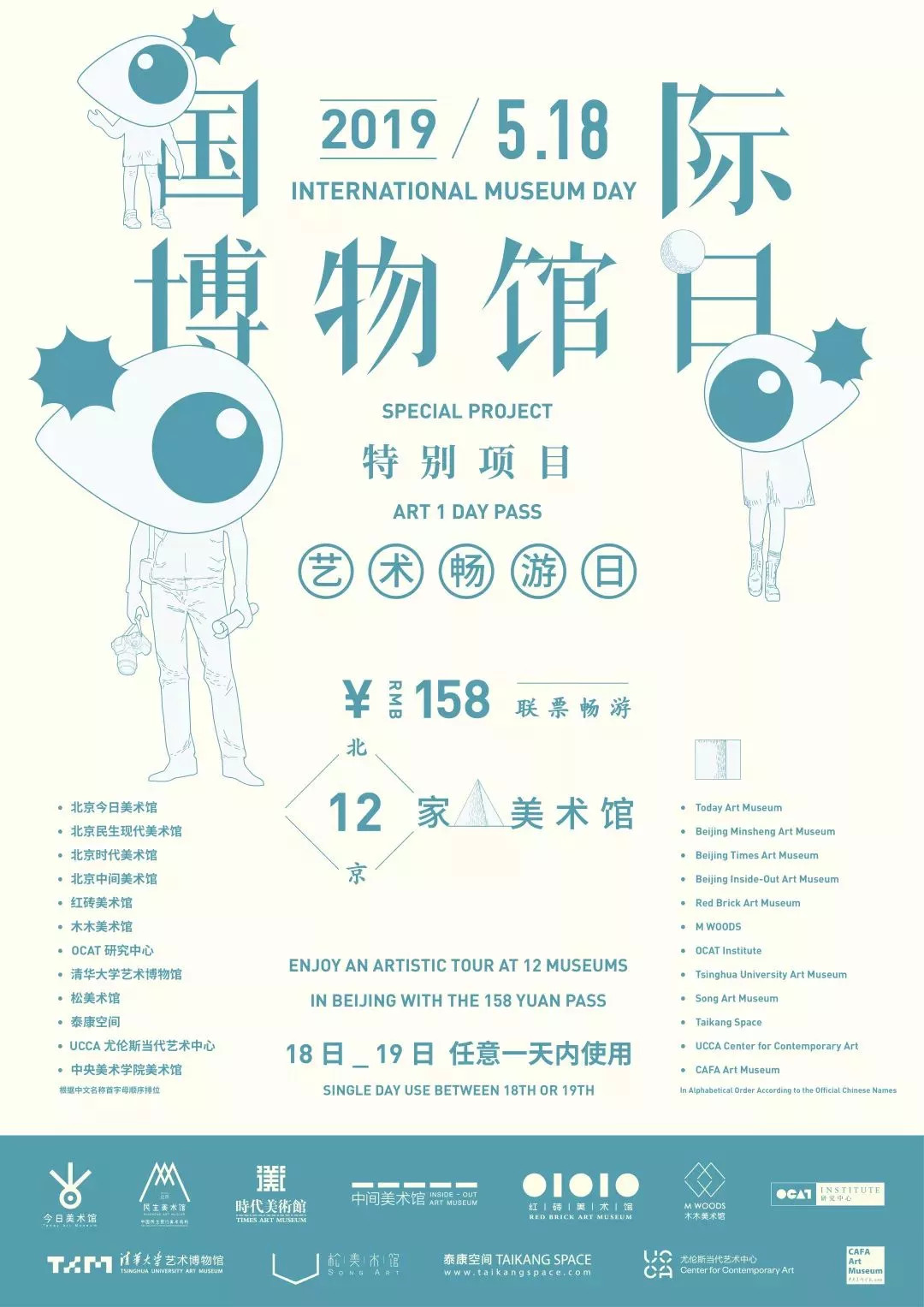 北京地区12家艺术机构首次联合推出2019年国际博物馆日特别项目——“ART 1 DAY PASS”艺术畅游日电子联票,购买158元“艺术畅游日电子联票”,可参观北京今日美术馆、北京民生现代美术馆、北京时代美术馆、北京中间美术馆、红砖美术馆、木木美术馆、OCAT研究中心、清华大学艺术博物馆、松美术馆、泰康空间、UCCA尤伦斯当代艺术中心、中央美术学院美术馆共12家美术馆,体验一日艺术畅游。观众持此票可在5月18日或19日参观12家美术馆,体验一日艺术畅游。