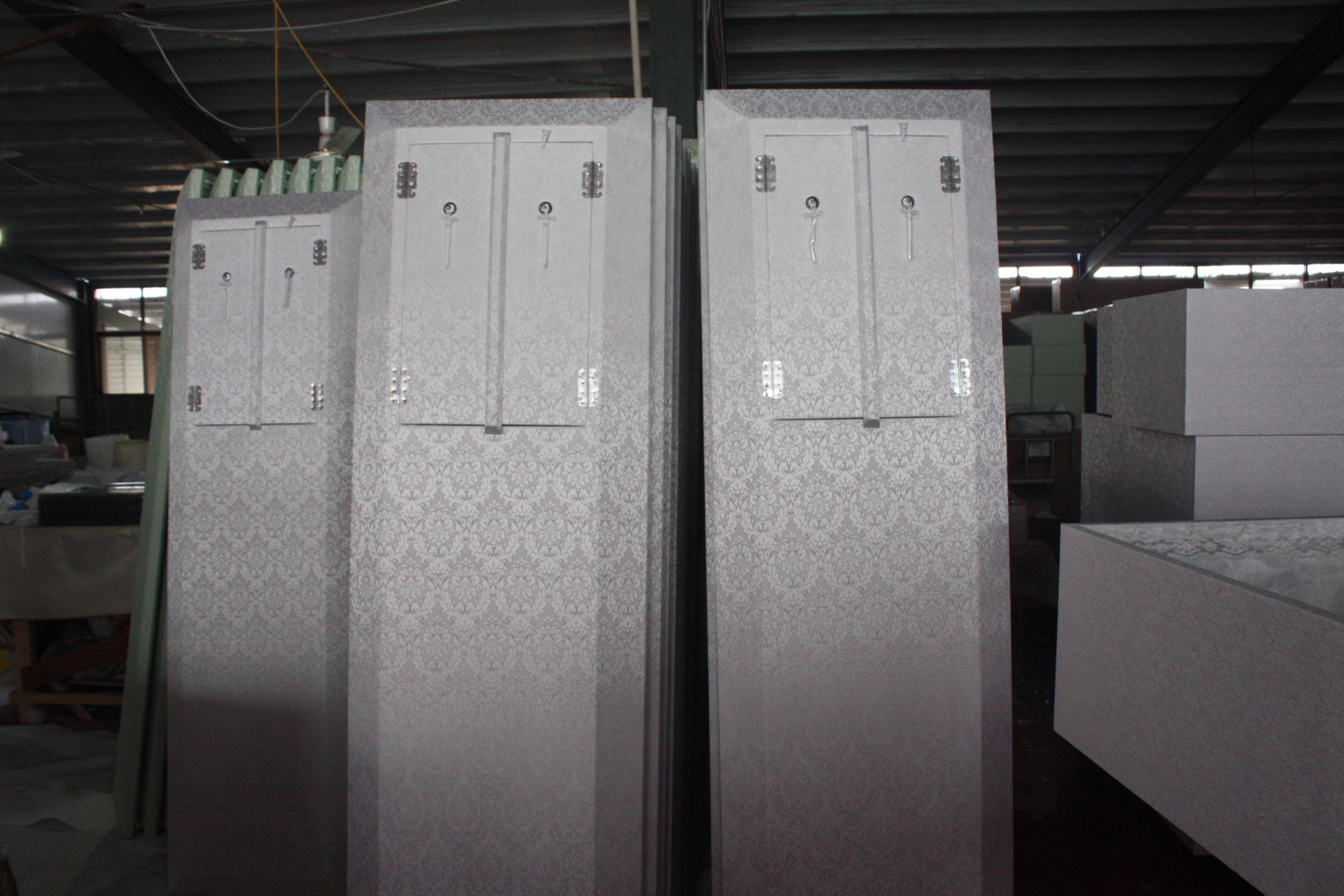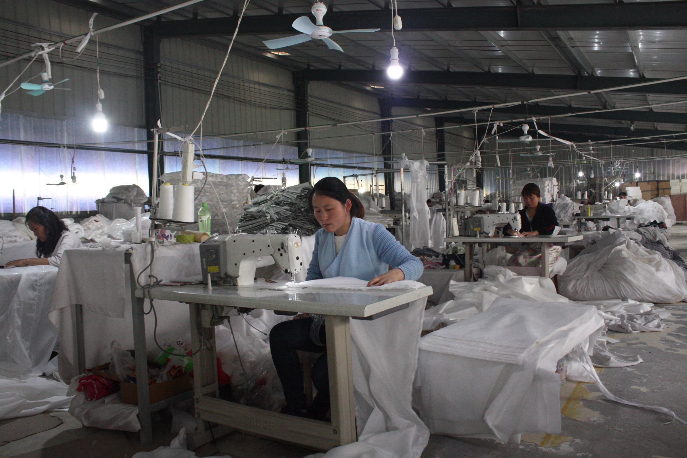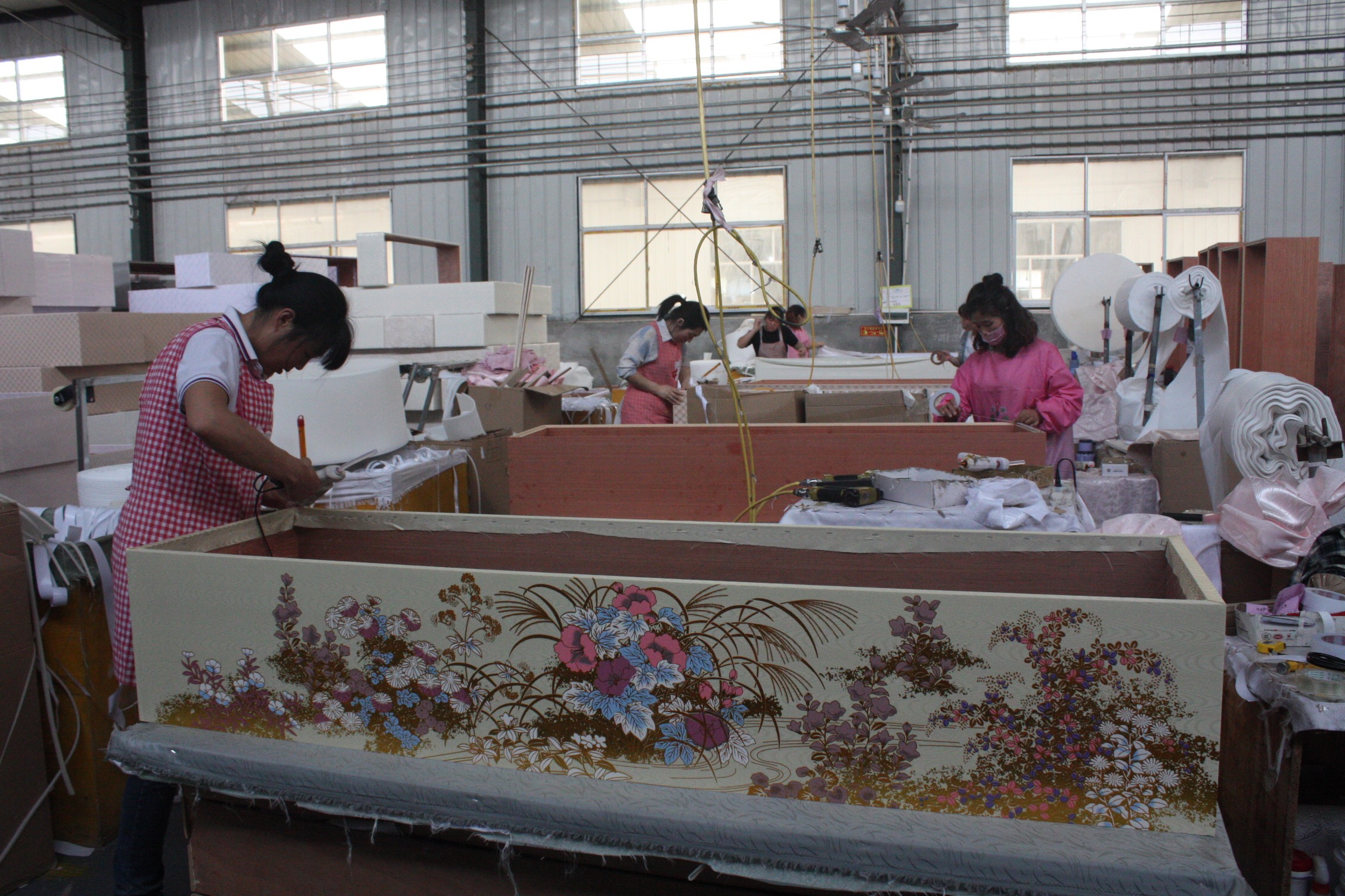 由于最热销的是布棺,棺材厂的布料装饰车间往往比木材加工车间人多。德弘的装饰车间有100多女工,木材车间大约20多男工。