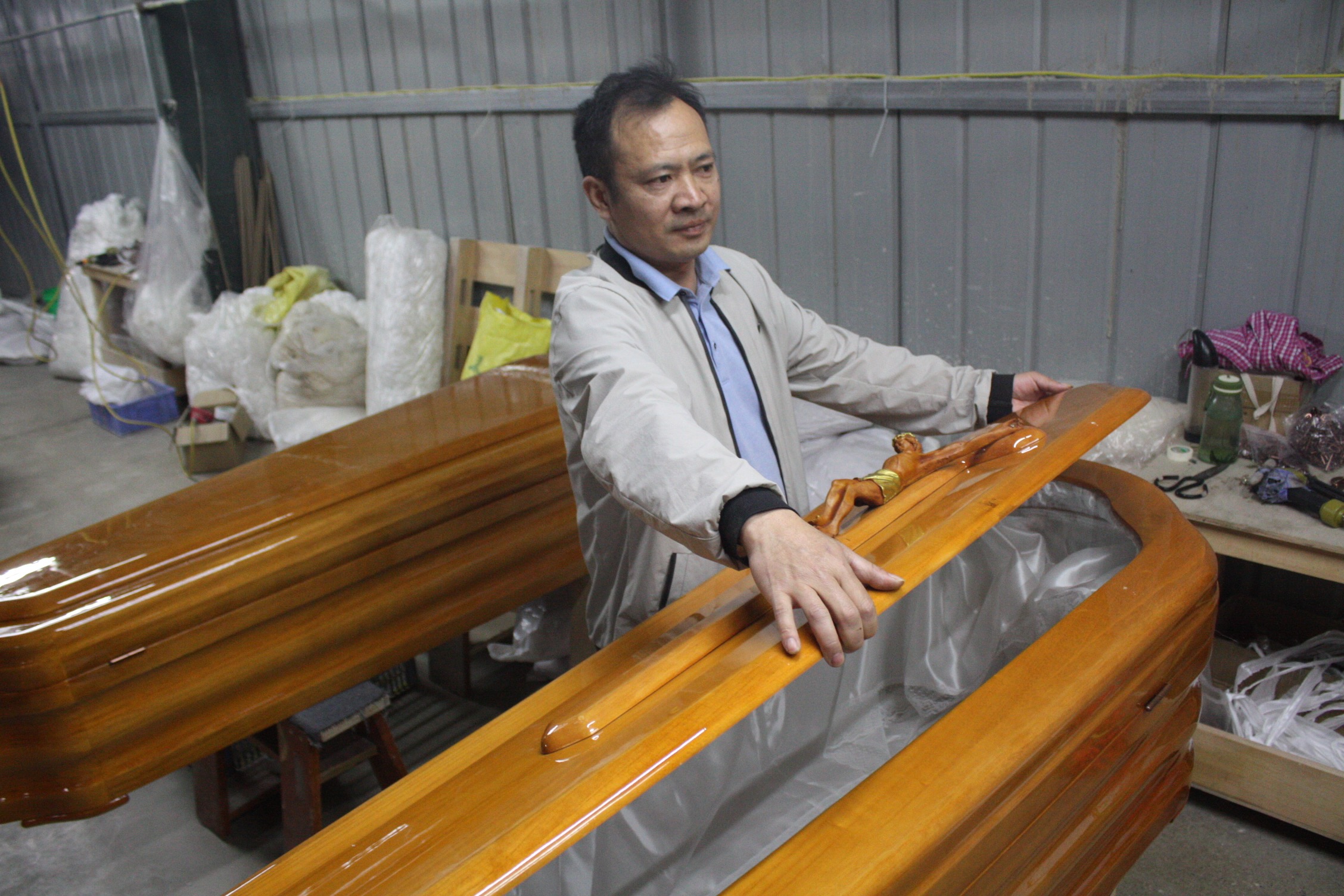 古安华做的棺材主要出口西班牙、意大利和美国。一共有三种款式,不同于日本的“山形棺”,生产的都是圆弧型,棺材板上面装饰了耶稣受难像。欧美国家的棺材用于土葬,每一口大约36公斤,700元人民币左右。