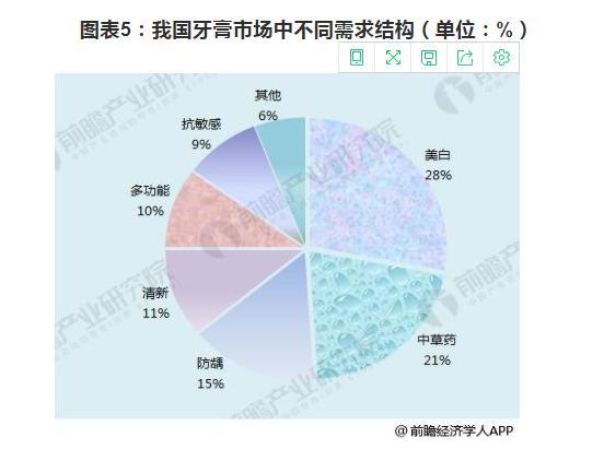 另外,在抗敏感牙膏这一垂直领域,冷酸灵一家的份额就达到了80%,而抗敏也一直是冷酸灵主打的产品功能。但从国内牙膏市场的需求结构上看,美白类需求以百分之28的比例位居第一,其次中草药为21%,而冷酸灵一贯主打的抗敏感需求则只占到总需求的9%,垂直品类下的市场天花板早已显现。
