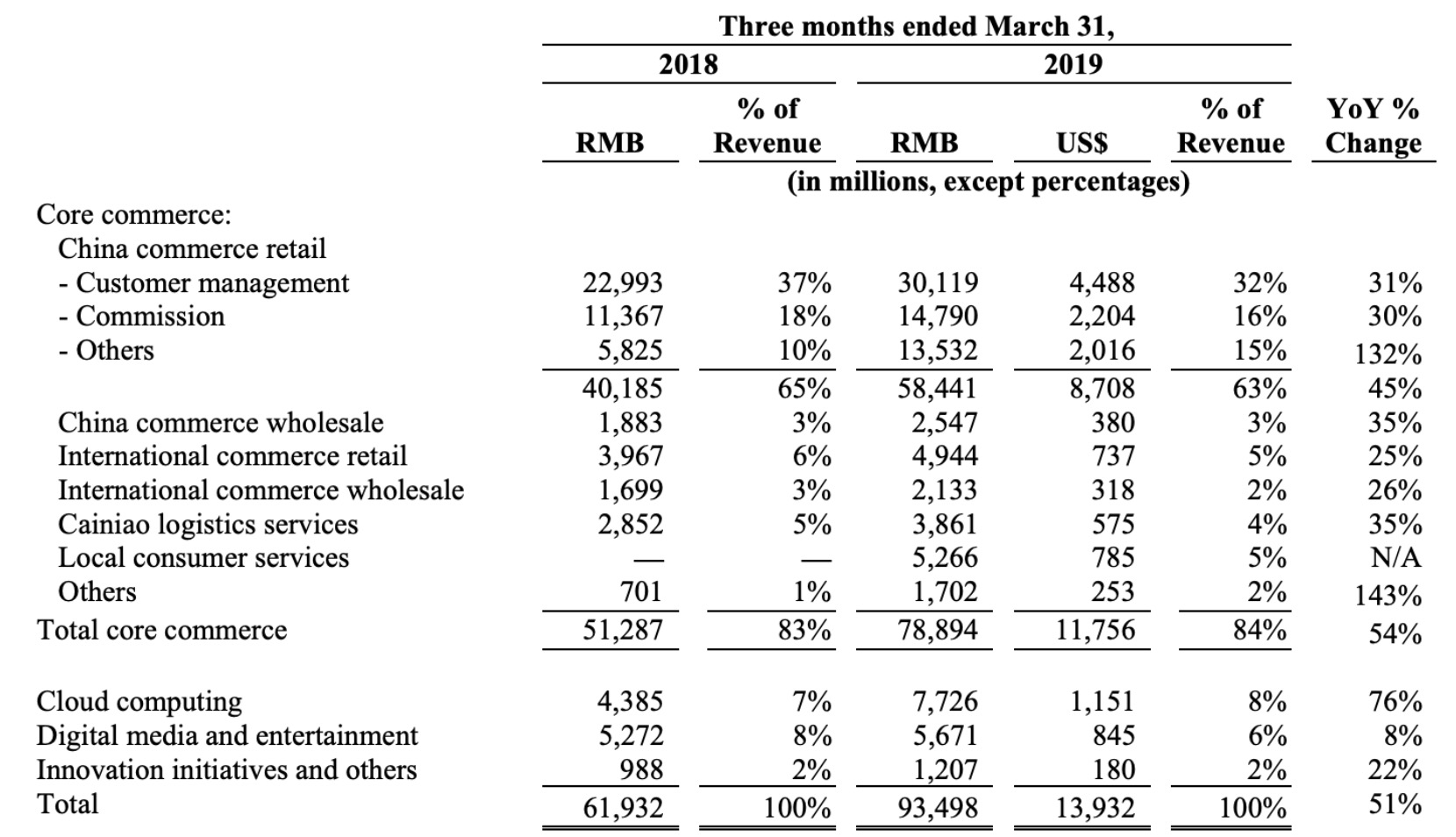 截至三月底,年度活跃消费者达6.54亿,比去年同期增长1.02亿。天猫实物商品交易额2019财年同比增长31%,第四季度同比增长33%,增速超过同业增长。