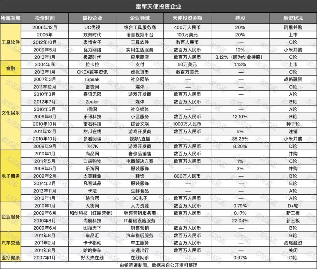 铅笔道根据公开资料整理雷军作为天使投资人出手的项目有32个,其中超过80%主要发生在2011年之前。这些项目中,有2个公司上市,3个登陆新三板,2个被小米并购,1个被阿里收购,另外9个项目走到了C轮及以后。