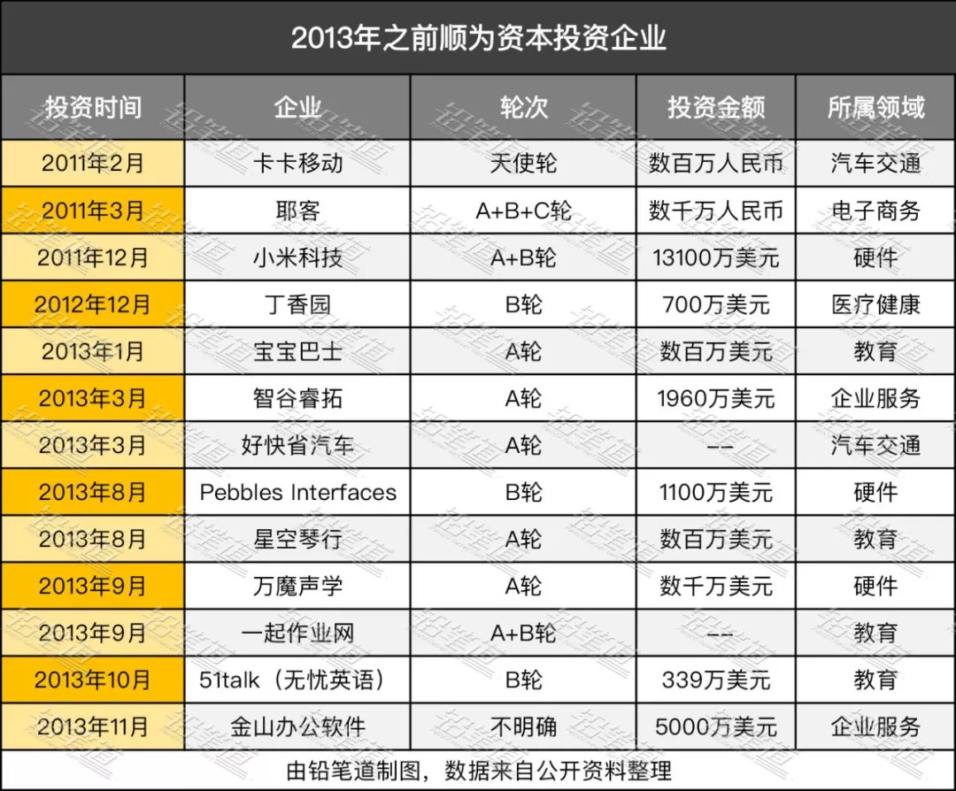 2013年之前顺为资本投资企业