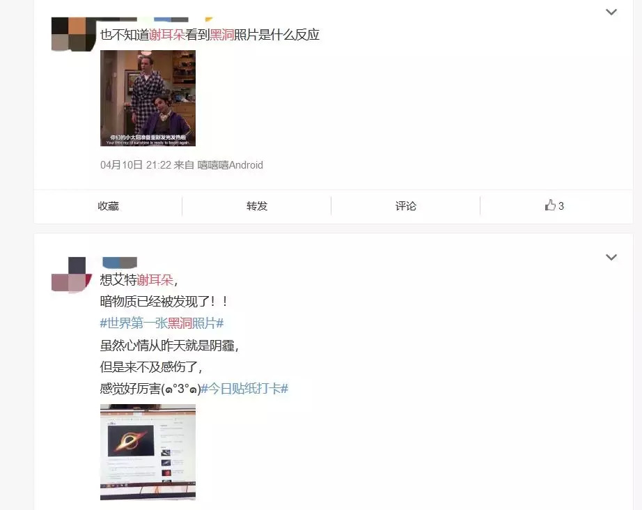 像萌萌一样,《生活大爆炸》给观众带来的不仅是消遣,还能感受到角色的成长、人性的温暖,甚至是科学的魅力。在4月2日世界首张黑洞照片公布时,很多微博网友想起了剧中沉迷研究黑洞的“谢耳朵”,呼唤到“想艾特谢耳朵”。