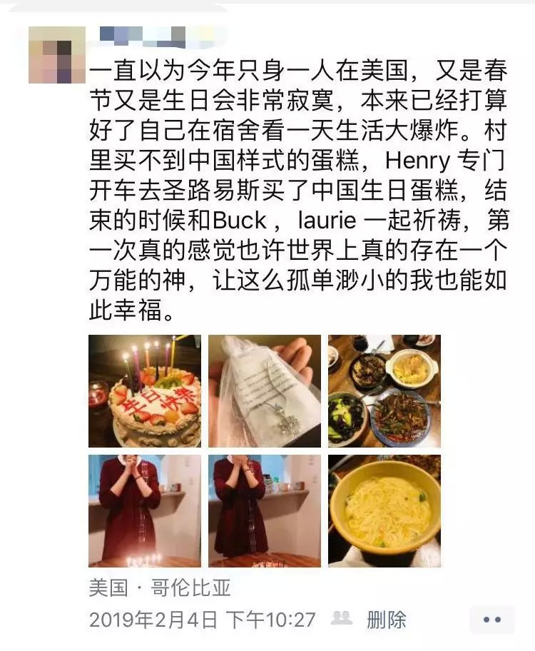 她告诉刺猬公社(ID:ciweigongshe),今年的大年三十是她的生日,她本打算一个人在宿舍看《生活大爆炸》度过。没想到,她的美国朋友为她准备了生日惊喜。“那天的场景真的就像《生活大爆炸》里朋友给谢耳朵过生日一样,虽然求学的人都很孤独,但是有朋友真的太好了。”