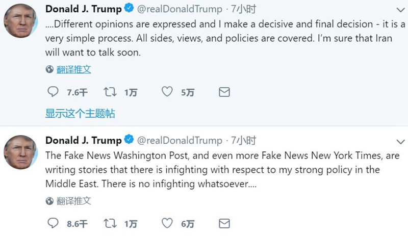 对于在伊朗问题上出现内斗的报道,特朗普本人周三在Twitter发文回应,指责媒体制造假新闻,称自己与顾问没有发生内斗,“每个人表达了不同的观点,我做最后决定”。
