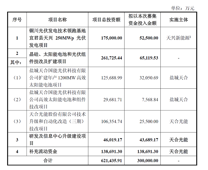 招股说明书显示,天合光能拟发行不超过4.4亿股股份,募资30亿元,用于光伏电池、组件技术改造及扩产,铜川领跑者基地250MW光伏项目,研发及信息中心升级建设项目,和补充流动资金。这其中,约13.87亿元的募集资金将用于天合光能补充流动资金。