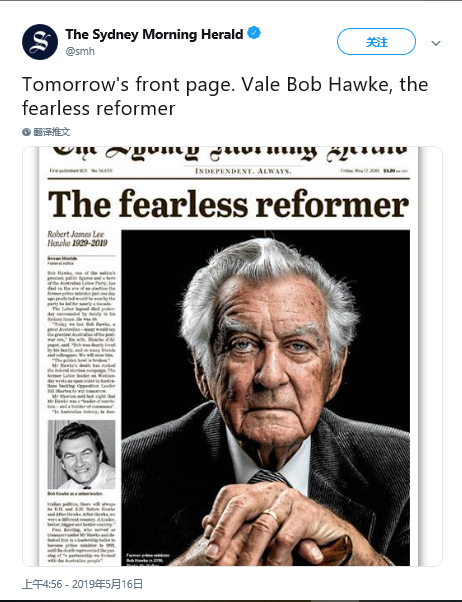 霍克从1983年到1991年8年里担任总理,是工党史上任职时间最长的政府首脑,至今仍保持着75%的在位总理支持率最高纪录。更重要的是,霍克是该国史上最具改革精神的领导人之一,为澳大利亚的社会体制奠定了坚实基础。《悉尼先驱晨报》5月17日头版的讣告标题就是《无畏的改革者》。