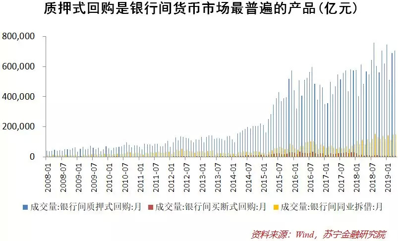 央行在多份报告中和多个场合都提到,由于DR007完全由市场决定,因而能更好地反映银行体系流动性松紧状况。从交易规模来看,质押式回购是最大的。