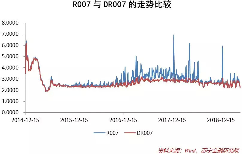 在质押式回购中,DR007也是最为普遍的产品,交易规模是货币市场中最大的。同时,DR007似乎还比R007波动性更小,且更贴近政策利率的下限,更适合央行用来监控。