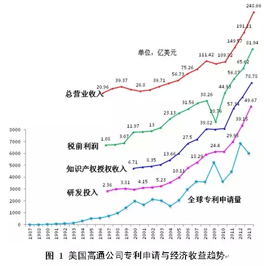 高通立足于军用卫星通讯技术基础,准确地识别出具有专利转化前景的无线通信技术领域,持续开展大量的研发投入。该公司自1987年申请第一件专利,到2000年开始依靠专利技术转化获取收益以来,花了整整14年。截至2000年,高通公司申请专利近2000件,其中有效专利已达1000余件,实现了专利转化收益持续增长,其利润基本上是来自专利许可收入。这表明,专利为企业带来经济效益,需要长远的技术选择、持续的研发投入、高质量的专利积累(详见图1)。