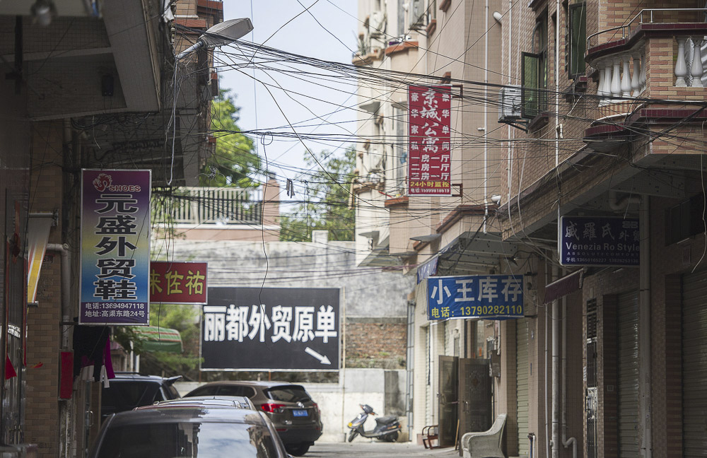 题图:2015年12月25日,广东东莞,厚街寮厦的出租屋楼下挂着众多“外贸鞋”的牌子。图片来自视觉中国。