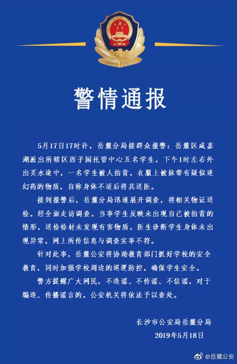 据湖南省长沙市公安局岳麓分局官方微博发布警情通报,5月17日17时许,岳麓分局接群众报警:岳麓区废嘉湖派出所辖区西子园托管中心五名学生,下午1时左右外出买水途中,一名学生被人拍背,衣服上被抹带有疑仪迷幻药的物质,自称身体不适后将其送医。
