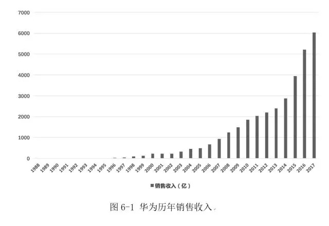 华为自1987年创立至今,历时31年,经历过多次变革,实现了多个方面的跨越:销售收入规模从0发展到2017年6036亿元;员工从6人发展到18万人;从一家贸易代理企业发展为同时拥有运营商事业群、企业事业群和消费者事业群三大业务;从行业积极跟随者到行业领先者。