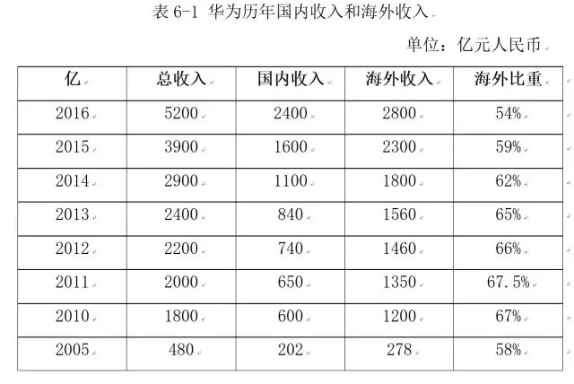 华为的国际化道路是成功的。1999年时,华为的海外收入仅5300万美元,占总销售收入的不到4%;到2005年,华为海外销售额已经达到48亿美元,占公司总销售额的58%,首次超过国内;2010年,华为的总收入为1850亿元,其中海外收入1204亿,占总收入的65%。