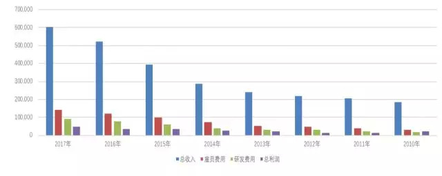 图6-2 华为2011-2017年总营业收入、雇员支出、研发支出与净利润对比