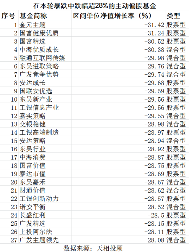 具体到单只基金方面,有多达327只基金跌幅超过两成,占比接近七成;多达83只基金跌幅超过25%或创业板指数跌幅,跌幅前三位的主动基金分别为金元主题、国富健康优质和国富精选,区间跌幅分别高达31.42%、31.24%和30.52%,富安达成长、国联安优选、东吴新产业和工银信息产业等4只基金区间跌幅超过29%,另有9只基金区间跌幅超过28%,这些基金在本轮暴跌中受伤最深。