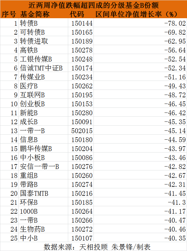 据天相投顾统计,近两周有多达65只分级基金B份额单位净值跌幅超过30%,跌幅超40%的则达到25只,杠杆最高的3只可转债分级B份额净值上演大跳水,银华转债B、东吴可转债B和招商转债进取近两周单位净值累计下跌78.02%、69.82%和62.95%,这些基金净值杠杆较高,而在实际投资中基金经理又会自加杠杆投资,使得可转债分级B份额实际杠杆在所有分级中处于最高水平,跌幅也最为惨烈。