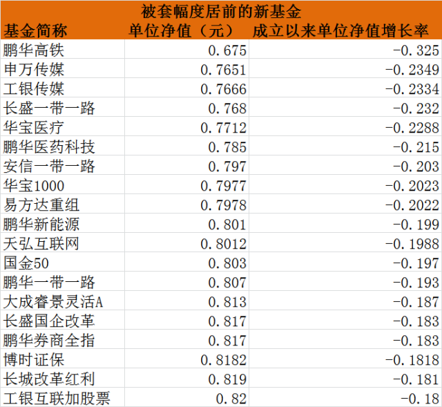 在高位过快建仓使得不少新基金成立以来净值直线跳水,截至上周五,有多只新基金成立以来亏损在20%以上,其中主要是分级基金和部分主动基金。天相投顾统计显示,截至6月26日,有9只基金成立以来亏损幅度超过20%,其中,鹏华高铁成立以来亏损达到32.5%,被套幅度最大。申万传媒、工银传媒、长盛一带一路、华宝医疗、安信一带一路、华宝1000、易方达重组等分级基金基础份额成立以来被套幅度均在20%以上,过快建仓是这些分级基金深度被套的主因。