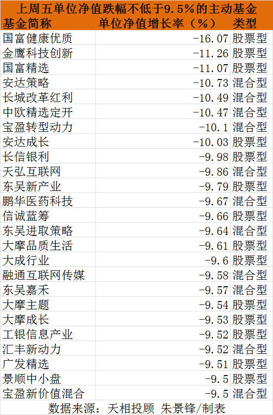 而在混合型基金中,也有多达181只基金上周五跌幅超过7.2%,意味着这些基金仓位在九成以上,其中有10只基金跌幅超过9.5%,富安达策略、长城改革红利、中欧精选和宝盈转型动力跌幅均超过10%。