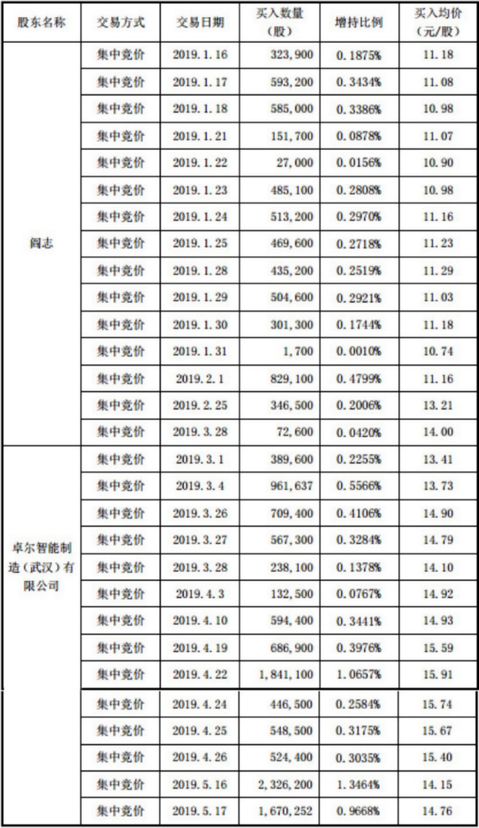 3月起,卓尔智能加入增持行列。3月1日至5月17日,卓尔智能合计增持总股本的6.74%,增持价格在13.41元-15.91元。