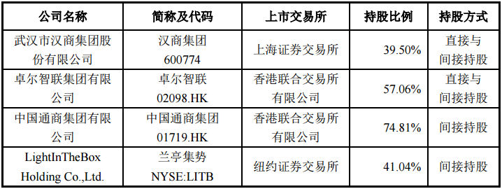 阎志直接或间接控制境内外四家上市公司。包括持股A股上市公司汉商集团39.50%股份,持有港股上市公司卓尔智联57.06%股份,持有港股上市公司中国通商集团74.81%股份,持有美股上市公司兰亭集势41.04%股份。