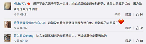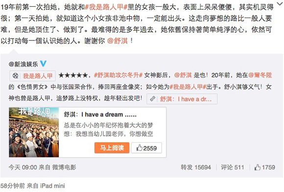 这些经历都被舒淇写进了影评中:“小小的年纪”、“大大的梦想”。文中还时不时卖萌调侃,“写到这,不自主地尾巴小翘了起来,呵呵~”这样的文字,说是影评,不如看成是一篇对自己的真实记录。“我就那么迷迷糊糊地、努努力力地、咬文嚼字地……一路上贵人不断地走到了现在。”