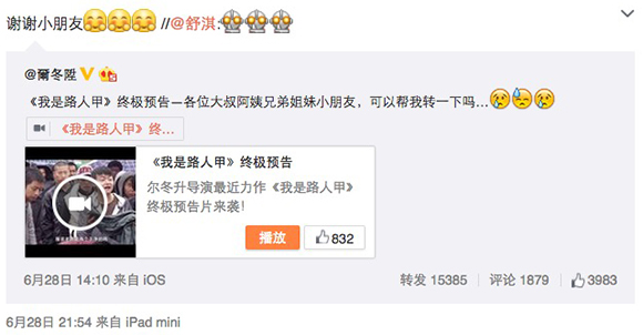 “还记得在横店骑单车放烟花看流星的朝伟吗”?6月28日晚9点,电影《我是路人甲》剧组又爆出一条重量级大明星的预告:继梁朝伟为尔冬升导演写下《听见流星的声音》后,第二天早9点将献上第二篇情真意切的美文。