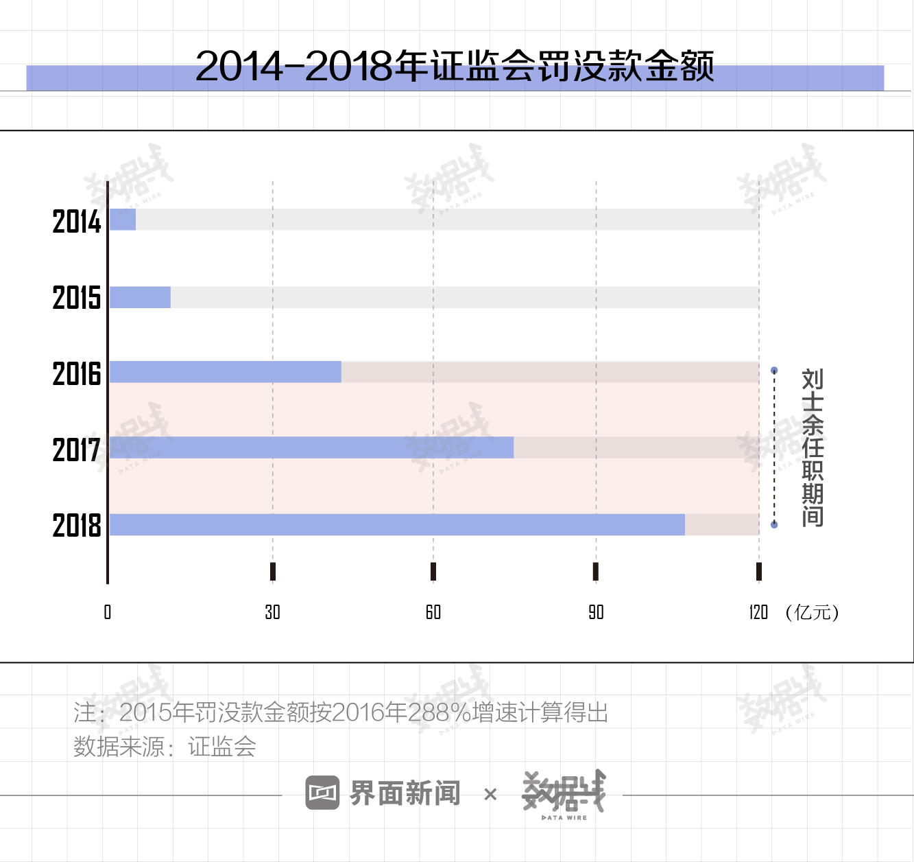 在任三年,刘士余的“监管风暴”不断卷起罚没金额新高。根据证监会行政处罚执行情况,2014年罚没款金额仅为4.68亿元。在刘士余上任后,罚没金额不断创下历史新高。2018年罚没款突破百亿,共计106.41亿元。